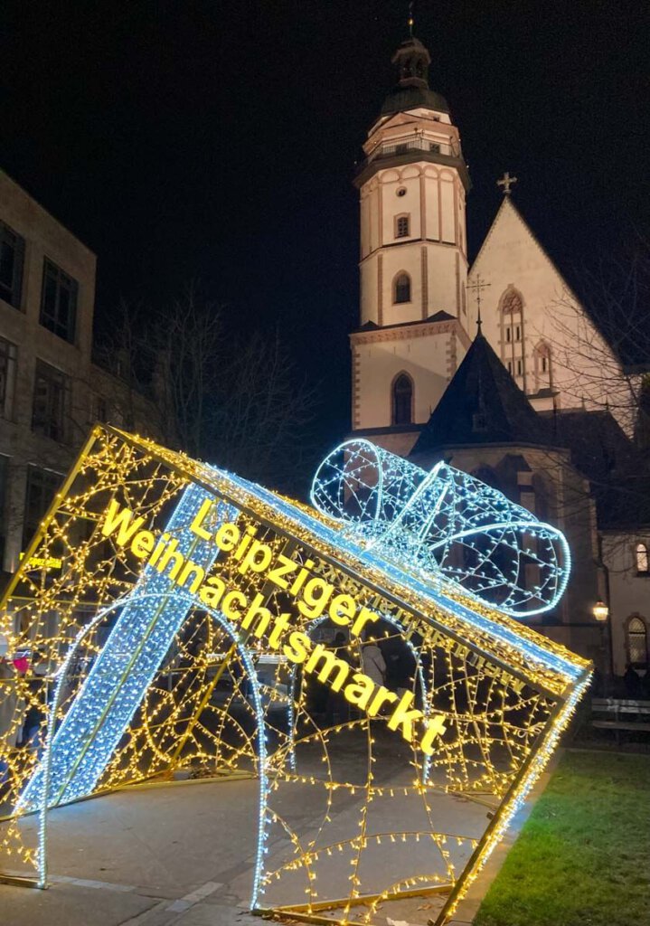 Wir verlassen den Markt und gehen weiter zur Thomaswiese vor der gleichnamigen Kirche. Hier stehen Büdchen mit Holzkunst und Handwerk aus dem Erzgebirge. Die Thomaswiese wird in der Weihnachtszeit vom Chor der Engel und einem großen Lichtbogen illuminiert.